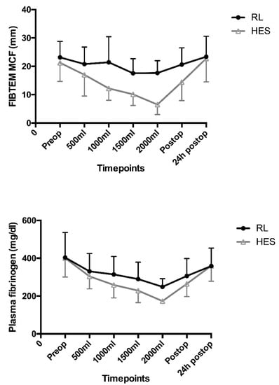 ROTEM is a viscoelastic method that allows real-time assessment of clot formation and dissolution in whole blood []. EXTEM, INTEM, and FIBTEM are commercially available ROTEM tests that refer to abnormalities in the extrinsic and intrinsic system, as well as fibrinogen polymerization and fibrinolysis. These tests, as well as PT, aPTT, plasma fibrinogen levels, and blood count, were measured preoperatively, after every 500 mL of fluid bolus (i.e., every second bolus of RL or HES), at the end of the surgery, and 24 h postoperatively. Blood samples were drawn from the arterial lines into tubes containing trisodium citrate 3.8% for ROTEM and conventional coagulation tests and containing potassium EDTA for blood cell counts (both Vacuette, Greiner, Kremsmuenster, Austria). ROTEM assays (Tem GmbH, Munich, Germany) were performed according to the manufacturer’s recommendations, and clotting time (CT) and maximum clot firmness (MCF) were analyzed.
