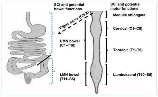 Abbreviations: C—cervical; T—thoracic; L—Lumbar; S—sacral; GI—gastrointestinal; SCI—spinal cord injury; SPNs—sympathetic preganglionic neurons; UMN—upper motor neuron; LMN—lower motor neuron.