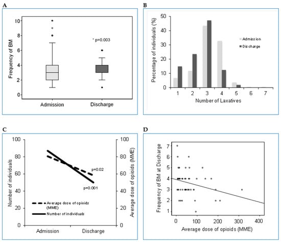 Regarding the whole cohort, there was no correlation between average dose of opioids (MME) and frequency of BM at admission. However, there was a significant negative correlation between average dose of opioids (MME) and frequency of BM at discharge, confirming the constipating effect of opioids (r = −0.20, p = 0.009; Figure 2D).