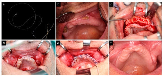 Irrespective of the suture material applied, resection of necrotic jawbone was performed until bleeding of viable bone was obtained. This was followed by smoothening of sharp bone edges and subsequent soft tissue closure (mucoperiostal flap) using either BS and Prolene® 4-0 or Vicryl® 4-0 sutures as described above. A clinical example of a typical surgery using BS is shown in Figure 1 and in the Supplementary Video S1.