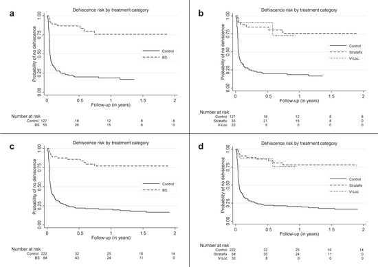 Kaplan–Meier plots of treatment groups for all patients and for patients without prior surgery. (a): barbed sutures (BS) and control group including patients without prior surgery; (b): Stratafix, V-Loc™, and control group including patients without prior surgery; (c): BS and control group including all patients; and (d): Stratafix, V-Loc™, and control group including all patients.