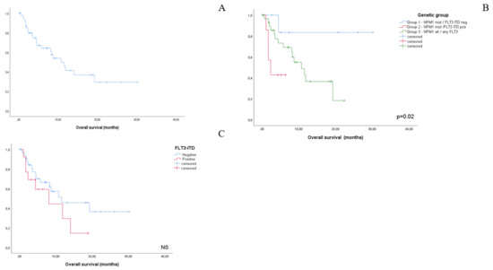 Kaplan-Meier plots representing overall survival for the whole study cohort (A), by NPM1/FLT3-ITD-based genetic grup (B) and by FLT3-ITD status alone (C). Despite not reaching statistical significance, a clear tendency towards a worse outcome for FLT3-ITD positive patients can be noted.