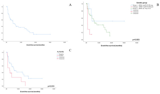 Kaplan-Meier plots representing event-free survival for the whole study cohort (A), by NPM1/FLT3-ITD-based genetic group (B) and by FLT3-ITD status alone (C).
