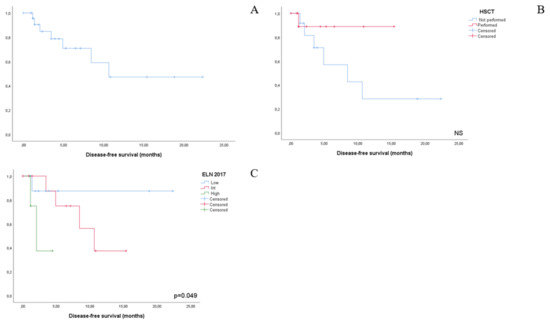 Kaplan-Meier plots representing disease-free survival for the shole study cohort (A), by HSCT bridging (B) and by ELN 2017 risk group (C). Despite not reaching statistical significance due to the small sample size involved, a protective effect for HSCT can be desumed from (B).