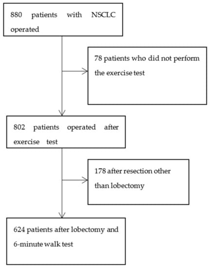Between 1 November 2011 and 30 November 2016, 880 patients were operated on due to non-small cell lung cancer (NSCLC) in the Thoracic Surgery Department of the Medical University of Gdansk, Poland. We excluded 178 patients who had resections other than a lobectomy and 78 patients who did not perform the 6MWT due to medical conditions. A group of 624 patients who underwent a 6MWT on the day before the operation entered this study. The study flow chart is presented in Figure 1. This study was a retrospective analysis of the prospectively gathered data. The data were obtained from the Krajowa Baza Raka Pluca (National Registry of Lung Cancer)—a national, obligatory registry of all curative resections performed in patients with lung cancer in Poland. The registry data were matched with the supplemental data about the 6MWT.