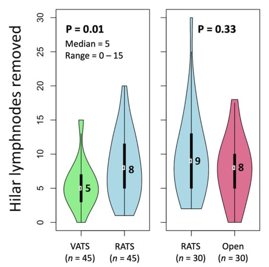 In the second matched analysis, we compared 45 VATS and 45 RATS cases. Baseline patient characteristics in the RATS and VATS matched groups are presented in Table S2, while intervention and tumor characteristics are reported in Table S3. When comparing these groups, a significantly higher median number of hilar lymph nodes (8 versus 5, p = 0.01) and stations (5 versus 4, p < 0.0001) was removed in the case of RATS (Table 5 and Figure 1). However, pain severity scores and pain interference scores at 2 weeks were lower for VATS than for RATS (p = 0.004; p = 0.01); the number of patients consuming pain killers did not differ between groups (Table 6). No significant difference was observed in conversions, complications, duration of surgery, and postoperative stay (Table 6).