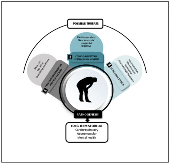 Multisystem long-term sequelae are being described following severe acute respiratory syndrome coronavirus 2 (SARS-CoV-2) infection, with a high impact at cardiorespiratory, neuromuscular [] and psychological levels [,] and possibly other systems []. The latest reports have established that 26% of patients needed hospitalisation, and among them, 14% required an intensive care unit (ICU) admission and/or respiratory support []. The long-term sequelae of the infection are now beginning to be defined; many may seriously impair the health of individuals and have important knock-on economic effects []. Given the similarities between coronavirus disease 2019 (COVID-19) and diseases caused by other coronaviruses [], post-acute and long-term sequelae that require specific treatment should be expected [,]. The number of people eventually requiring attention for COVID-19 sequelae could be high: on 30 January 2021, the present pandemic had already affected 102,107,858 people worldwide [], being the main worldwide health problem with an uncertain future.