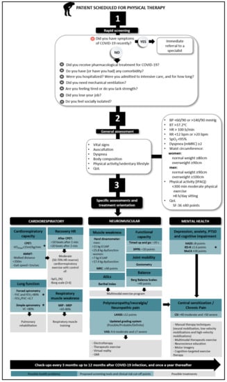 This includes a number of simple assessments to detect health concerns that should indicate any condition that might be driving the emergence or perpetuation of more serious health issues (Figure 2). The results provide information regarding the need for more specific assessments and help in the design of intervention strategies. It should be remembered that COVID-19 commonly affects persons with a sedentary lifestyle and reduced physical activity [], who are usually overweight and/or who have hypertension, cardiovascular disease and/or diabetes []. It may well be that after suffering from COVID-19, patients move even less than before []. This can facilitate the appearance of comorbidities or accentuate those already present []. RPs should therefore encourage salutogenesis in their patients []. Online technologies, which have already been used in other health settings for this purpose [], might be adapted for use with survivors of COVID-19.