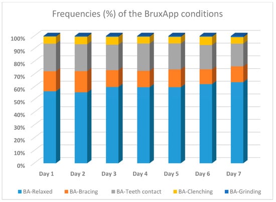 The mean frequencies for each of the BruxApp conditions per day, over the seven-day observation period, are presented in Figure 1. The mean frequencies of the different BruxApp conditions, over the seven report days, ranged as follows: BA-relaxed: 55.5–63.7%; BA-bracing: 11.6–19.8%; BA-teeth contact: 17.9–21.7%; BA-clenching: 5–6.5%; BA-grinding: 0.4–0.9%. The lowest CV was observed for the condition BA-relaxed (0.48) and the highest for the condition BA-grinding (5.19).