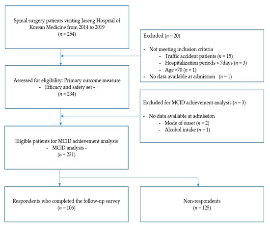 We included 254 patients who experienced recurrent LBP or leg pain after back surgery with subsequent admission to one of four regional network KM hospitals in this study. Among them, we excluded 20 patients with missing data regarding pain at admission or not meeting the enrolment criteria. Consequently, 234 patients were included in the analysis set. For MCID analysis, 231 patients were included after excluding two and one patient(s) due to missing data regarding the reason for onset and drinking status at admission. Further, 106 patients completed the follow-up questionnaire survey via telephone or internet (Figure 1).