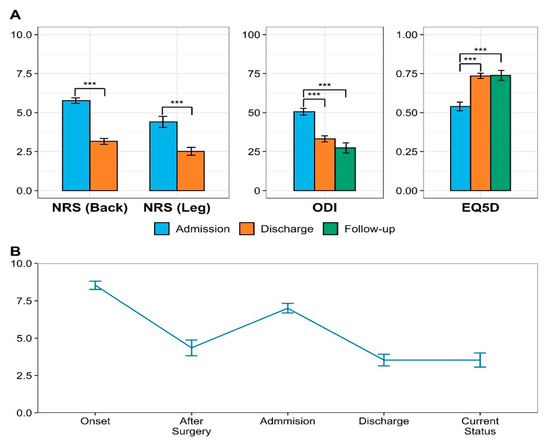 There was a significant post-treatment improvement in the NRS, ODI, and EQ-5D scores of patients with FBSS. The NRS score for LBP decreased by 2.62 points (from 5.77 ± 1.38 points at admission to 3.15 ± 1.49 points at discharge; 95% CI: 2.41–2.82). The NRS score for leg pain decreased by 1.88 points (from 4.40 ± 2.76 points at admission to 2.52 ± 1.99 points at discharge; 95% CI: 1.68–2.08). These findings were indicative of a significant improvement in pain (Figure 2A) (p < 0.001). In the follow-up questionnaire survey, the mean NRS score at onset, after surgery, before admission to KM hospital, after discharge from KM hospital, and present time were 8.54 ± 1.45, 4.35 ± 2.75, 7.00 ± 1.67, 3.53 ± 2.03, and 3.54 ± 2.49, respectively (Figure 2B).