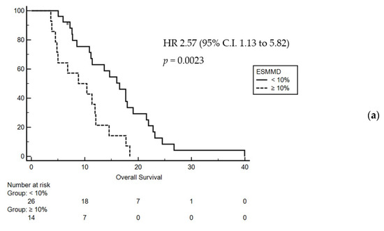 The prevailing role of ESMMD over baseline sarcopenia in metastatic setting has been previously reported not only for gastric cancer patients [20] but also in patients with different gastrointestinal cancers [24,25,26,27]. In the IMPACT trial, in particular, in patients with metastatic pancreatic cancer, ESMMD ≥ 10% was significantly associated with worse OS (HR: 2.16; 95% CI 1.23–3.78; p = 0.007) and PFS (HR: 2.31; 95% CI 1.30–4.09; p = 0.004) [27].