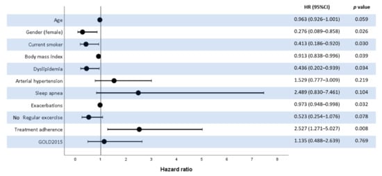 The final multivariate Cox regression model is shown in Figure 1. The model obtained allowed us to differentiate those clinical variables that influence or could predict the clinical response of the patients that have initiated the treatment with monotherapy. In particular, treatment adherence increased the likelihood of being a responder, whereas female gender, dyslipidemia, being an active smoker, body mass index, and previous exacerbations decreased this possibility. The exercise variable shows an association with response to therapy, suggesting that it could have a protective effect, and patients who practice exercise would therefore show better progression compared to those who do not, although these results did not reach the pre-specified significance threshold limit.
