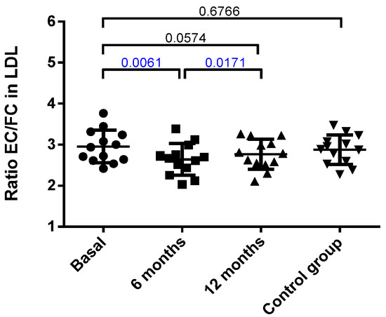Ratio of esterified cholesterol (EC) versus free cholesterol (FC) in LDL. Data were calculated from the % of mass of each component, as described in the Methods, and are expressed as mean ± SD. Bars indicate P. Blue values indicate statistically significant differences.
