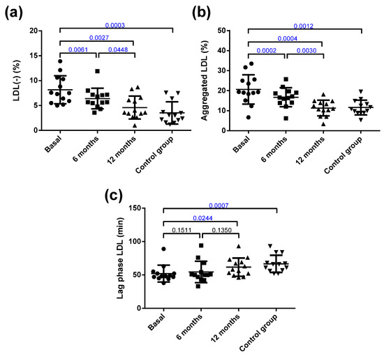 Qualitative characteristics of LDL. (a) Proportion of electronegative LDL (LDL(-)) determined by anion-exchange chromatography. (b) Susceptibility to aggregation. The proportion of aggregated LDL was determined by gel filtration chromatography after in vitro lipolysis with SMase. (c) Susceptibility to oxidation induced by CuSO4 incubation, expressed as lag phase time. Data are expressed as mean ± SD. Bars indicate P. Blue values indicate statistically significant differences.