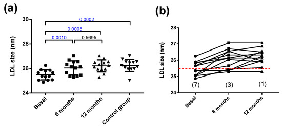 LDL size. (a) LDL size determined by non-denaturing gradient gel electrophoresis. (b) Individual changes in LDL size after bariatric surgery. The dashed red line indicates 25.5 nm, the threshold between LDL subfraction phenotypes A and B, and numbers in parentheses indicate the number of patients with the atherogenic phenotype B. Data are expressed as mean ± SD. Bars indicate P. Blue values indicate statistically significant differences.