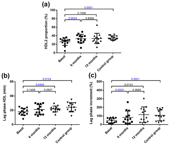 Qualitative characteristics of HDL. (a) Proportion of HDL2 (large HDL) determined by non-denaturing gradient gel electrophoresis. (b) Susceptibility to oxidation induced by CuSO4 incubation, expressed as lag phase time. (c) Antioxidant capacity of HDL to prevent the oxidation of LDL, expressed as an increment of the lag phase time. Data are expressed as mean ± SD. Bars indicate P. Blue values indicate statistically significant differences.