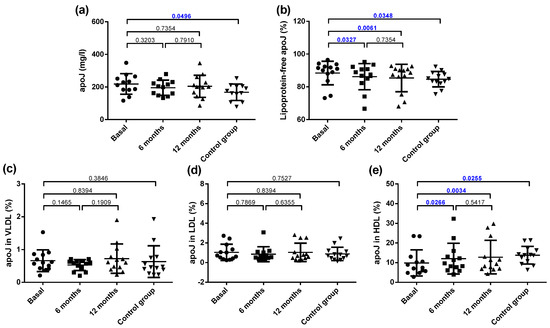 Plasma apoJ concentration and distribution in lipoproteins. (a) Total plasma apoJ. (b) Proportion of apoJ not bound to lipoproteins. (c) Proportion of apoJ bound to VLDL. (d) Proportion of apoJ bound to LDL. (e) Proportion of apoJ bound to HDL. Data are expressed as mean ± SD. Bars indicate P. Blue values indicate statistically significant differences.