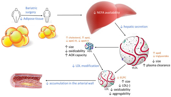 From these findings, a scheme can be drawn (Figure 7) in which the decrease in central adiposity after bariatric surgery shifts the altered qualitative characteristics of LDL and HDL to a non-atherogenic phenotype. The driving force could be a decrease in the available free fatty acids in the liver because of the loss of adipose tissue. This decreases hepatic VLDL secretion, which adds to the increased apoE content in VLDL, favoring its receptor-mediated clearance. Consequently, VLDL particles are smaller, and their metabolism in blood generates large LDL particles, which are less susceptible to oxidation. In parallel, the size and composition of HDL particles becomes closer to the composition of healthy subjects. As a result, the capacity of HDL to prevent modification improves, and less modified LDL particles are found in circulation. As a whole, the functions of LDL and HDL in obese patients are normalized after bariatric surgery. Of note, the improvement of the lipoprotein function after surgery occurs in some cases without a complete normalization of the lipoprotein composition and size, suggesting a threshold beyond which lipoprotein function becomes normal.