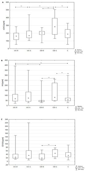 (A–C) Circulating total sulfated glycosaminoglycans (GAGs), hyaluronic acid (HA), and soluble syndecan-1 (sCD138) levels in healthy subjects and patients with inflammatory bowel diseases (IBD) before and after 12-month therapy. Note: Results are expressed as median, interquartile (25th–75th percentiles) range, and minimum and maximum of data in the groups. C: healthy subjects (control); UC-0: patients with ulcerative colitis before adalimumab therapy; UC-1: patients with ulcerative colitis after 12-month adalimumab therapy; CD-0: patients with Crohn’s disease before prednisone therapy; CD-1: patients with Crohn’s disease after 12-month prednisone therapy. HA, hyaluronic acid; sGAG, sulfated glycosaminoglycans; sCD138, soluble syndecan-1; ** p < 0.01, statistically significant.