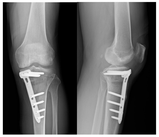 - Brinkman, J.-M.; Lobenhoffer, P.; Agneskirchner, J.D.; Staubli, A.E.; Wymenga, A.B.; van Heerwaarden, R.J. Osteotomies around the knee: Patient selection, stability of fixation and bone healing in high tibial osteotomies. J. Bone Jt. Surg. 2008, 90, 1548–1557. [Google Scholar] [CrossRef] [PubMed]