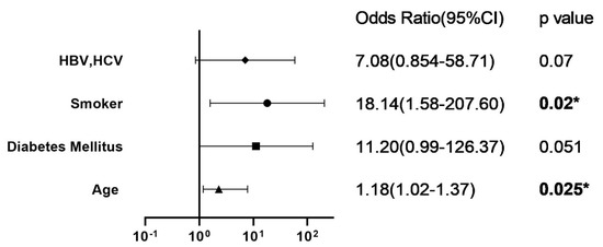 Four variables, including smoking, hepatitis B and C, age, and diabetes mellitus, were selected using the backward logistic regression method. In this model, SSI after MOWHTO was positively associated with smoking (OR 18.14, 95% CI 1.58–207.6) and age (OR 1.18, 95% CI 1.02–1.37) (Figure 3).