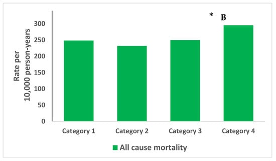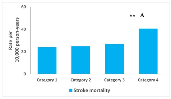 During the 32 years of follow-up, 5736 (64.1%) subjects died, and 595 (6.7%) died from a stroke. Rates of stroke mortality increased by 69.2% from 24.0 (per 10,000 person years) in the most satisfied group to 40.6 (per 10,000 person years) in the least satisfied group (Figure 1A). Rates of all-cause mortality increased by 19% from 248.5 (per 10,000 person years) in the most satisfied group to 295.3 (per 10,000 person years) in the least satisfied group (Figure 1B). A sensitivity analysis found that the rate of mortality of younger (<50 years old) participants in the least satisfied category at recruitment was 39.4% higher than those in the most satisfied category (p = 0.0007). A less dramatic increase of 6.5% was seen in older (>50 years old) participants (p = 0.314).