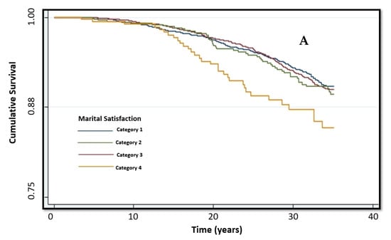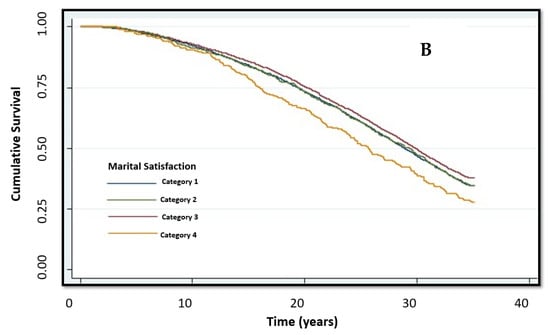 Marriage has been described as the most important and fundamental human relationship because it provides the primary structure for establishing a family and social support []. Research indicates that the quality of the marital relationship is associated with health outcomes [,]. Marital quality is defined through a subjective, global evaluation of the relationship and behaviors in the relationship []. A previous meta-analysis [] concluded that higher marital quality was related to lower risk of mortality (mean effect size, r = 0.11). Marital satisfaction is an important factor of marital quality; other factors include cohesion, affection, and conflict. Several studies found that marital satisfaction is associated with lower risk of early mortality among populations with disease-related issues (e.g., congestive heart failure [] and coronary artery bypass grafting []). However, we cannot draw conclusions from these studies regarding whether marital satisfaction can predict long-term health outcomes, such as mortality, among samples that are not health-compromised.