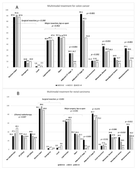 Multimodal management for colon (A) and rectal (B) carcinoma by low, intermediate and high ACCI groups. Bars represent n (%) except p-values.