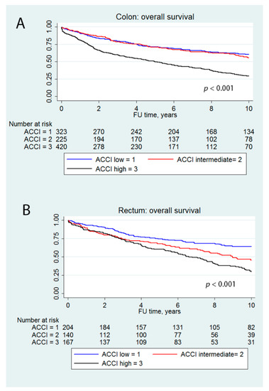 Five-year OS from stages I–IV colon and rectal carcinoma was worse in the high ACCI group compared to low and medium ACCI groups: For colon (Figure 2A), the OS was 71.5% for low ACCI, 71.1% for intermediate ACCI and 49.8% for high ACCI. For rectum (Figure 2B) the OS was 74.4%, 67.8% and 60.4%, respectively. Five-year CSS by low, intermediate and high ACCI from stages I–IV colon was 75.9%, 77.2% and 68.9% (p = 0.056) and from rectal cancer 78.3%, 79.1% and 79.4% (p = 0.913), respectively. Five-year disease-free survival (DFS) by low, intermediate and high ACCI from stages I–III colon cancer was 78.3%, 80.5% and 80.1% (p = 0.904) and from stages I–III rectal cancer 75.9%, 74.4 and 76.5 (p = 0.788), respectively.