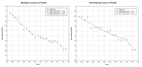 Mortality rates were obtained by year, gender, race, ethnicity, state, and the urban–rural continuum according to the 2013 urbanization area classification. To obtain age-adjusted mortality rates, we used a U.S. standard population of year 2000. Mortality rates are given as number of deaths per million. A joinpoint regression analysis was used to calculate the average annual percent change from 1999 to 2019. This analysis is also able to identify changes in trends over time [17].
