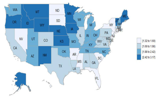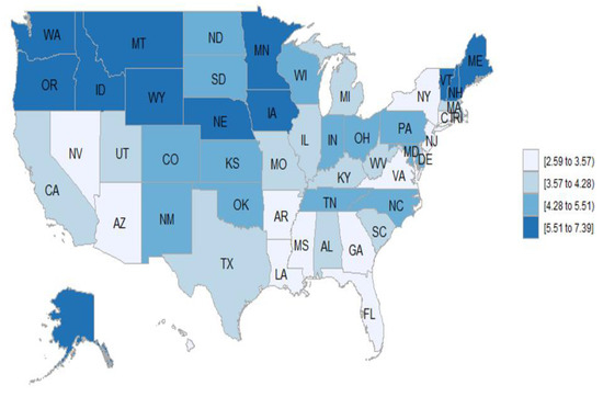 Looking at a map of the U.S., the states with the highest mortality both for vasculitis as MCD and the UCD were situated in the north of the United States (Figure 2 and Figure 3). In the case of vasculitis as MCD, the north–south differential was very evident, with all of the states with higher mortality rates falling above a horizontal line that could be drawn just south of Oregon, Idaho, Wyoming, Nebraska, Iowa, and New Hampshire (Figure 2). In the case of vasculitis as the UCD, there were only two southern states, New Mexico, and Kansas, that had high mortality rates. In the north, only North Dakota, South Dakota, New York, and a few states in the north east, including Connecticut and Rhode Island, had low mortality rates for vasculitis as the UCD (Figure 3).