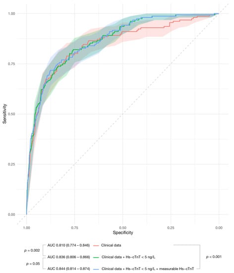 Table S1 presents the clinical variables independently associated with the primary endpoint: hypercholesterolemia, previous myocardial infarction, effort-related chest pain, chest pain recurrence within 24 h, admission systolic blood pressure, ST-segment depression, hemoglobin, and creatinine. The clinical model showed good discrimination accuracy for the primary endpoint (AUC = 0.810, 95% CI 0.775–0.846) (Table 3, Figure 1). However, undetectable hs-cTnT added significant predictive information (HR = 3.80; 95% CI 2.27–6.35; p = 0.00001) and improved model performance (AUC = 0.836, 95% CI 0.806–0.866; p = 0.002; in comparison with the clinical model alone). When introducing measurable hs-cTnT concentrations (above the detection limit but below the 99th percentile), undetectable hs-cTnT remained significant (HR = 2.36; 95% CI 1.06–4.20; p = 0.004), and measurable hs-cTnT gave additional information (per 0.1 ng/L; HR = 1.13; CI 1.06–1.20; p = 0.0001). The AUC showed the best discrimination accuracy (AUC = 0.844, 95% CI 0.814–0.874; p = 0.05 in comparison with the clinical plus undetectable hs-cTnT model). Overall, hs-cTnT concentrations alone were inferior to clinical data (AUC: 0.739, 95% CI 0.704–0.774; p = 0.002 in comparison with the clinical model); however, as expressed in Table 3 and Figure 1, hs-cTnT concentrations added meaningful information to clinical data. The results were quite similar for the secondary endpoint (Table 3). Here, the inclusion of measurable hs-cTnT also improved model performance (p = 0.04 compared to the clinical plus undetectable hs-cTnT model). In terms of 30-day events, measurable hs-cTnT did not provide significant information on top of clinical data and undetectable hs-cTnT (Table 3).