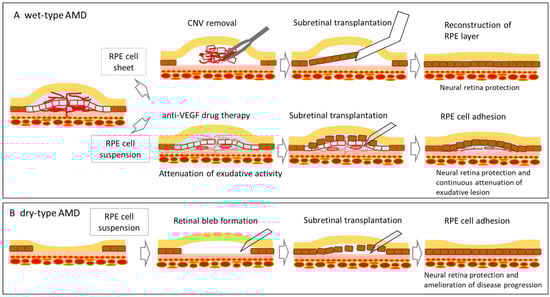 The conceptual mode of action of pluripotent stem cell-derived RPE cells for wet-type AMD (A) and dry-type AMD (B) in either formulation, RPE cell sheet, or RPE cell suspension were shown, respectively.
