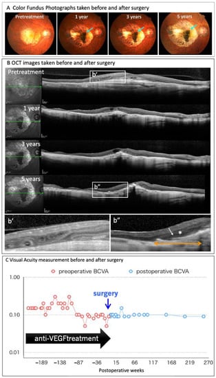 At five years after the surgery, the autologous iPSC-derived RPE sheet is stable the in sub-retinal transplantation site, while maintaining pigmentation. A slight increase in graft size is also noted (A, green arrows). Changes in the retinal structure before, and after, surgery are monitored using optical coherence tomography (OCT) (B). The ONL layer (*) and IS/OS line are identified at the RPE sheet-transplanted lesion (above the orange arrow), whereas the retinal structure is disrupted before surgery (b’). The patient’s corrected visual acuity is maintained after transplantation for five years without significant changes, and the anti-VEGF antibody treatment was completely discontinued after surgery (C).