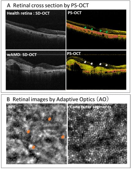 Visualization of the RPE layer using polarized optical coherence tomography (PS-OCT) (A). The RPE layer is clearer in the healthy retina (green arrows in the upper right panel) and wAMD retina (white arrows in the lower right panel) compared to those in SD-OCT images (left side panels). Retinal images obtained using adaptive optics (AO) (B). RPE cells with a hexagonal shape are observed in the retina with sub-retinal fluid (orange arrows in the left panel), and the outer segments of the cones are observed in the healthy retina (right panel).