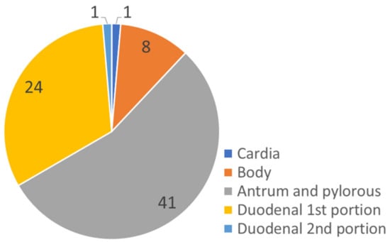 Fifty patients had gastric ulcer perforation, and twenty-five patients had duodenal ulcer perforation. The distribution of perforation sites is illustrated in Figure 1. Among the gastric ulcer patients, 41 patients had antrum and pyloric lesions, 8 had body lesions, and 1 had gastric cardia lesions. Duodenal ulcer perforation was mainly located on the first duodenal portion (24 cases), and only one case occurred in the second portion. Comparing the gastric and duodenal ulcer groups, alcohol use was significantly higher in the gastric ulcer group (29/50 (58.0%) versus 8/25 (32.0%), p = 0.034). Open surgery was preferred in the gastric ulcer perforation group (44/50 (88%) versus 17/25 (68%), p = 0.036). Other clinical variables were not significantly different between the gastric and duodenal ulcer groups.