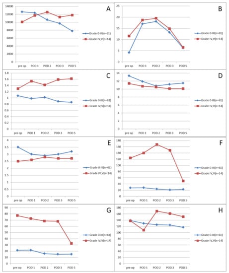 Selective laboratory findings according to the Clavien-Dindo classification. (A) WBC, (B) CRP, (C) creatinine, (D) hemoglobin, (E) albumin, (F) AST, (G) ALT, (H) glucose.