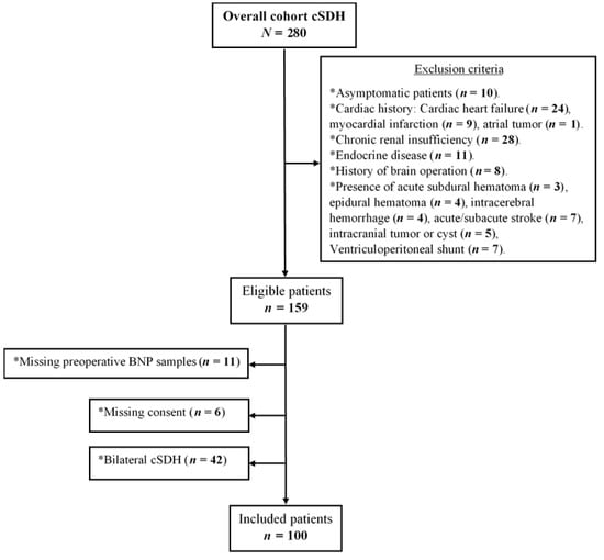 During the last two decades, several studies have shown that patient brain natriuretic peptide levels on admission (BNP) were elevated in many acute central nervous system (CNS) diseases, including stroke [4,5,6], hypertensive intracerebral hemorrhage (ICH) [7], aneurysmal subarachnoid hemorrhage (aSAH) [7,8,9,10,11] and traumatic brain injury (TBI) [12,13,14]. BNP has also been used as an indicator of disease severity [10,14] and as a predictor of long-term functional outcomes [12,15,16,17]. Although cSDH usually occurs at least three weeks after mild head trauma and does not represent an acute event relative to the aforementioned CNS diseases, we showed in a previous report that almost two-thirds of these patients unexpectedly presented with elevated BNP [18]. In a later report, we also demonstrated that BNP was a reliable predictor of postoperative long-term functional outcomes [19]. However, the reasons behind these increases in BNP levels remain unexplained.