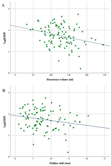 Scatterplot showing an inverse linear relationship between hematoma volumes and log10 brain natriuretic peptide serum levels (BNP) (A) and between midline shift (MLS) and log10BNP (B) in patients with symptomatic cSDH.