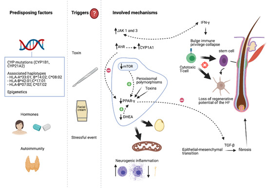 Different unknown triggers, such as facial creams/sunscreens, environmental toxins, surgery, or a stressful situation, may lead to FFA in genetically susceptible individuals. Autoimmunity may also contribute to the predisposition, so people with one autoimmune disease are more likely to have another one. Hormonal factors probably play a role in the development of FFA. Discontinuous lines indicate a regular relationship between two elements. JAK: Janus kinase; AhR: aryl hydrocarbon receptor-kynurenine; mTOR: mammalian target of rapamycin; PPAR-γ: peroxisome proliferator-activated receptor γ; DHEA: dehydroepiandrosterone; HF: hair follicle; IFN: interferon; TGF: transforming growth factor; HLA: human leukocyte antigen; CYP: cytochrome. Created with BioRender.com (accessed on 1 March 2021).