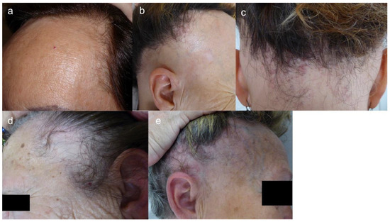 (a) Recession of both fronto-temporal hairlines, mimicking male AGA (AGA-like pattern). (b,c) Recession of the whole hairline, from frontal to occipital (ophiasis-like pattern). (d) Oval alopecic patches in the temporal region, sparing a thin band of temporal hairline (cockade-like pattern). (e) Recession of temporal hairline extending upwards to the parietal scalp (upsilon pattern). In this patient, the frontal hairline is also affected, but not the occipital area, and neither is the retroauricular region.