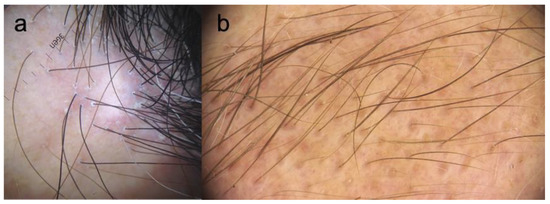 Perifollicular erythema and follicular hyperkeratosis, along with the loss of follicular openings in the affected hairline, are the main trichoscopic findings in FFA (Figure 4a) [22]. The presence of follicular ostia with only one hair shaft is another frequent feature. The background in FFA is ivory-white [146]. Perifollicular hyperpigmentation, as well as pinpoint white dots in the alopecic band, are characteristics of darker-skinned patients with FFA [15,16,147]. Black dots, broken hairs, pili torti, and branching capillaries may also be seen, as well white patches in advanced disease [148].