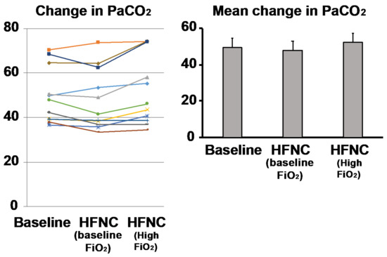 Response to HFNC with baseline oxygen utilization was associated with a reduction in PaCO2 from 49.5 ± 13.1 mm Hg to 47.2 ± 14.1 mm Hg (p = 0.13). The normocapnic group (defined as PaCO2 < 45 mm Hg; n = 5) showed reductions in PaCO2 from 38.9 ± 1.8 mm Hg to 36.6 ± 1.9 mm Hg (p = 0.08). The hypercapnic group (n = 6) showed reductions in PaCO2 from 58.2 ± 9.3 mm Hg to 57.1 ± 10.5 mm Hg when HFNC was applied (p = 0.55) (Figure 3).