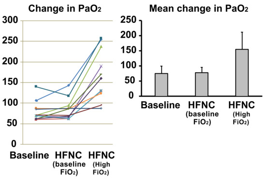 Response to increased oxygen delivery via high flow nasal cannula in COPD patients. The PaO2 did not show a significant change (p = 0.60) when HFNC was applied at baseline FiO2 and increased significantly (p < 0.001) when the FiO2 was increased by 30%. Each colored line represents the individual response of the patient.