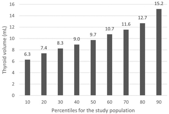 The quartiles of the thyroid volume for the study population were as follows: 1st quartile (Q1): 4.0–7.9 mL; 2nd quartile (Q2): 8.0–9.7 mL; 3rd quartile (Q3): 9.8–12.2 mL; 4th quartile (Q4): 12.3–20.4 mL. All the results of the calculations of percentiles for the thyroid volume in the study population are shown in Figure 1.