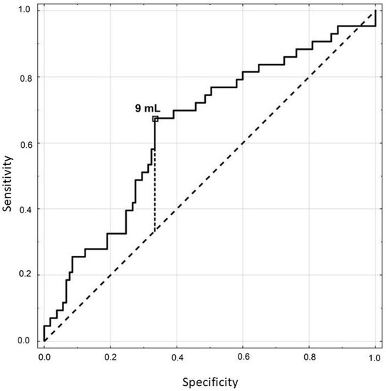 The optimal lower limit for the thyroid volume for TSH above 2.5 µIU/mL was determined to be 9 mL (Figure 2). This thyroid volume predicted the level of TSH with the sensitivity of 67%, specificity of 67% and accuracy of 67%. The area under the curve (AUC) was 0.646 (p = 0.0037).