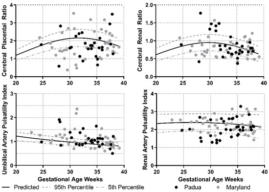 This is a retrospective analysis of data used for clinical management. It was approved by the University of Maryland Institutional Review Board (authorization HP-00072884) and by the Ethics Committee of the University of Padua (authorization P1826). Women who underwent prenatal ultrasound at the Center for Advanced Fetal Care at the University of Maryland Medical Center (UMMC) and at the University of Padua (UP) between 1 June and 1 December 2016 underwent assessment of the UAPI, MCAPI and the RAPI. Prior to this time, each center routinely evaluated the uterine, umbilical and middle cerebral artery Doppler waveforms and, in May 2016, after deciding to incorporate the renal artery into our fetal surveillance algorithm, began to obtain renal artery spectral Doppler information at both centers, regardless of the indication for the ultrasound. The last scan prior to delivery was included for analysis.