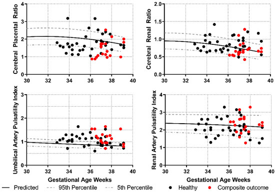 Our results show that among pregnancies complicated by FGR, fetal RA resistance does not increase among fetuses with FGR who develop short-term adverse outcomes. Our data are consistent with the absence of significant changes in the impedance to flow within the renal system, which is thought to occur because of relative fetal hypoxia among some FGR fetuses [3,6,15,31]. This is contrary to what we had expected to observe based on conventional views of the fetal response to acute intrapartum hypoxia [5]. Although we did not assess partial pressures of oxygen or oxygen saturation within the fetal blood, indirect signs of fetal placental vasculopathy are often evidenced by an increase in the UAPI, considered a sign of placental vascular disease [9,32,33]. If the relative chronic hypoxia in the FGR fetus is not a sign of hypoxia and vasculopathy but, rather, is secondary to poor or limited diffusion in the placenta, the expected decrease in CPR would be due to decreased impedance in the cerebral vasculature [34,35].