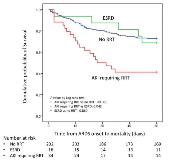 The patients’ demographic data, laboratory data, and ventilator parameters are shown in Table 1. The patients with AKI requiring RRT were younger than the no RRT patients and the ESRD patients, but these differences were not statistically significant. The patients with AKI requiring RRT had a higher ratio of underlying chronic liver disease or chronic kidney disease compared with the other patients, whereas the ESRD patients had a higher ratio of underlying diabetes mellitus and hypertension. The AKI patients requiring RRT and ESRD patients had significantly more severe conditions according to their PSI (AKI requiring RRT vs. no RRT: p value = 0.005, ESRD vs. no RRT: p value = 0.150), APACHE II (AKI requiring RRT vs. no RRT: p value =< 0.001, ESRD vs. no RRT: p value = 0.002), and SOFA scores (AKI requiring RRT vs. no RRT: p value =< 0.001, ESRD vs. no RRT: p value = 0.001), and they had significantly higher lactate (AKI requiring RRT vs. no RRT: p value = 0.003) and total bilirubin levels (AKI requiring RRT vs. no RRT: p value = 0.023) than no RRT patients. More patients with AKI requiring RRT needed vasopressor agents (AKI requiring RRT vs. no RRT: p value = 0.008, ESRD vs. no RRT: p value = 0.129). The platelet level was lower in patients who received RRT, but no significant difference in post hoc analysis (AKI requiring RRT vs. no RRT: p value = 0.150, ESRD vs. no RRT: p value = 0.097). More severe metabolic acidosis was noted in the AKI patients requiring RRT, but this difference was not statistically significant. Moreover, the patients with AKI requiring RRT had a poorer PaO2/FiO2 ratio (AKI requiring RRT vs. no RRT: p value = 0.028), and they needed higher peak airway pressure (AKI requiring RRT vs. no RRT: p value = 0.020).